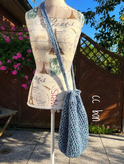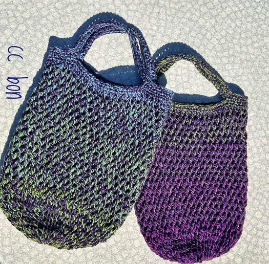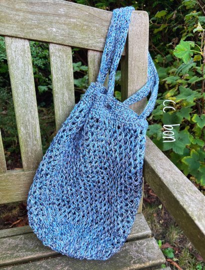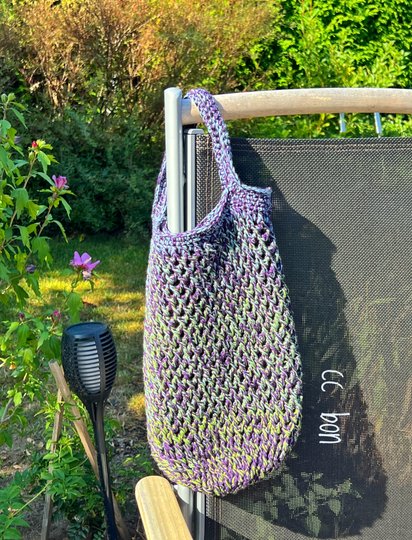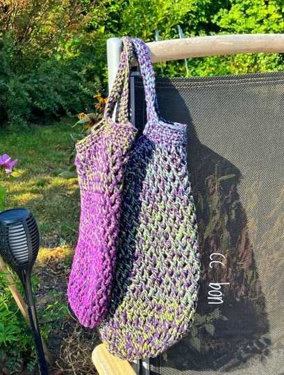 Es kann beliebiges Garn verwendet werden. Ich empfehle für die Verarbeitung ein Baumwoll- oder Baumwollmischgarn. Je nach Material und verwendeter Nadelstärke variieren Größe und Festigkeit des fertigen Netzes.
