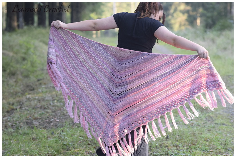 Das Tuch ist mit dem hier verwendeten Material 2,30 groß. Das Muster kann ganz nach Wunsch und Garnstärke erweitert oder verkurzt werden.