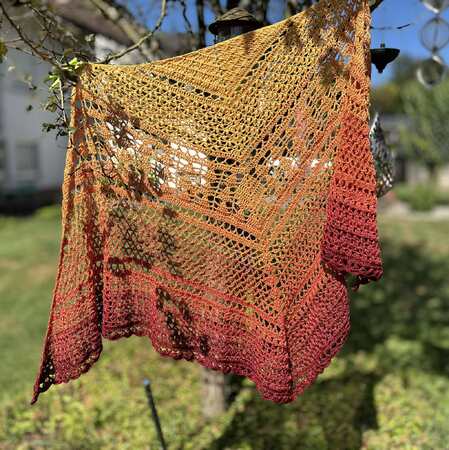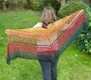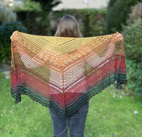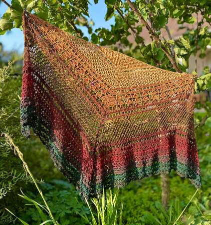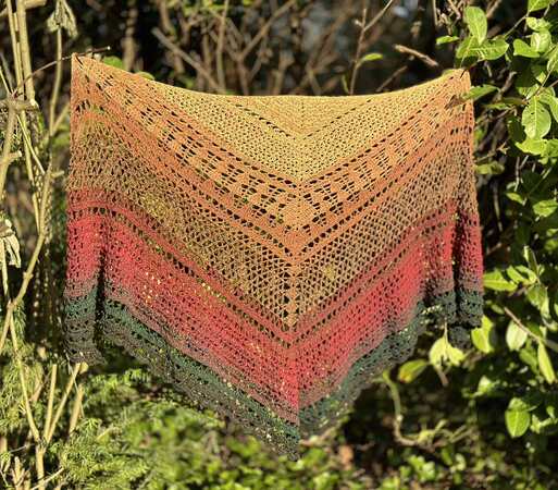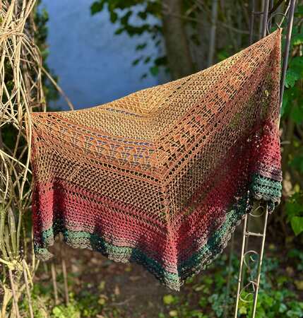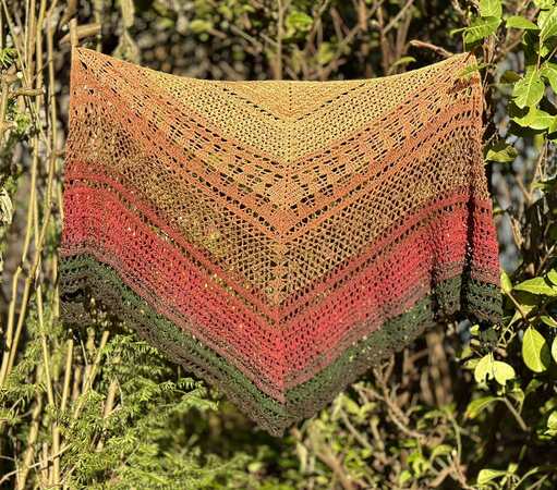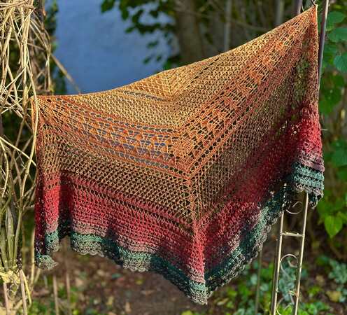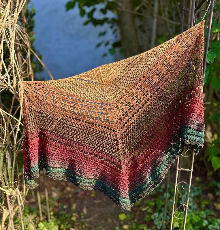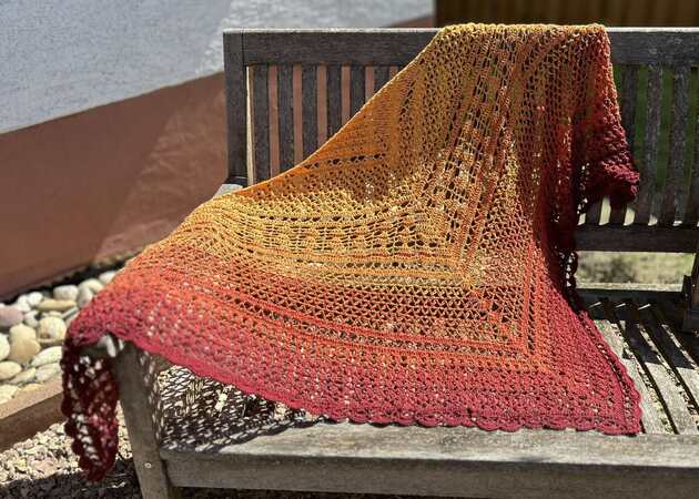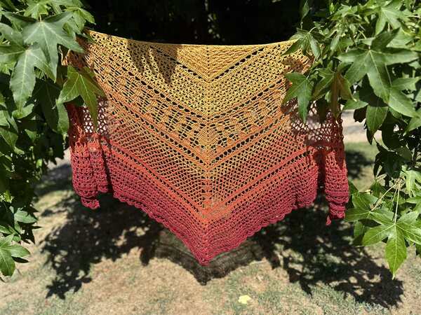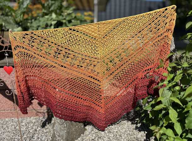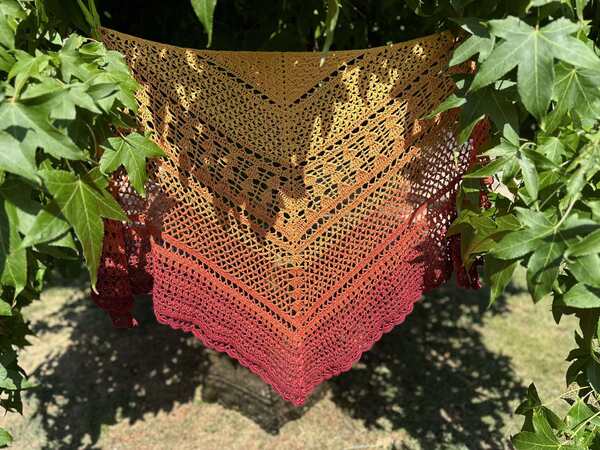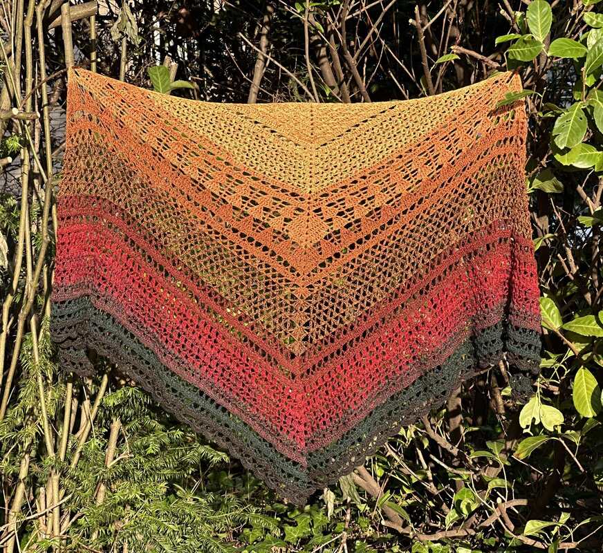 Mein Beispieltuch gehäkelt mit 1.200m/ 3-fädig und NS 3,5 hat eine Spannweite von 2,10m.