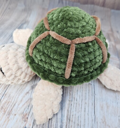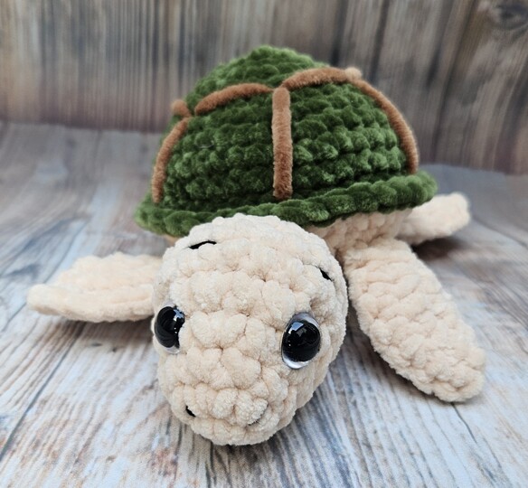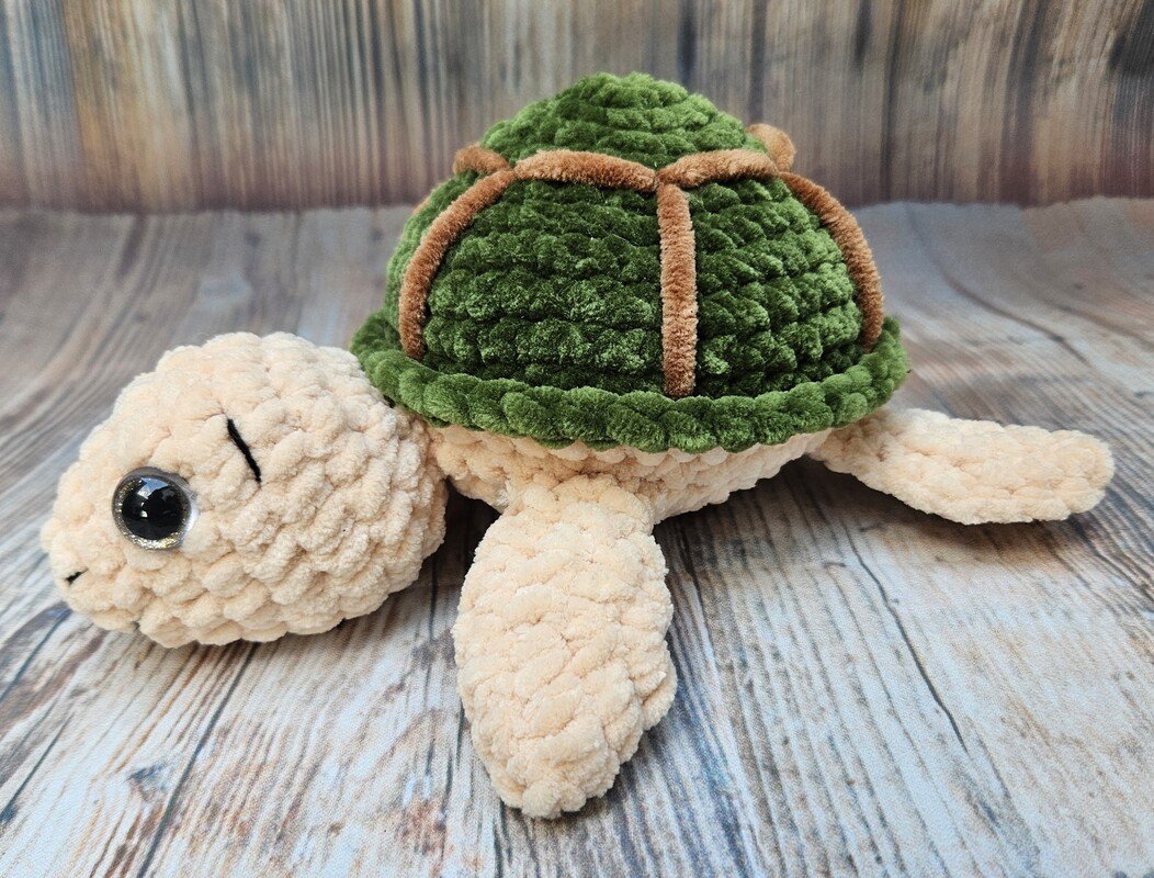 Mit der angegebenen Wolle und mit einer Nadelstärke von 5,5mm wird die Schildkröte eine Länge von ca. 22cm und eine Breite von ca. 16cm. Bitte beachtet, dass die Größe variieren kann.