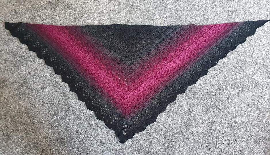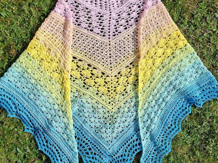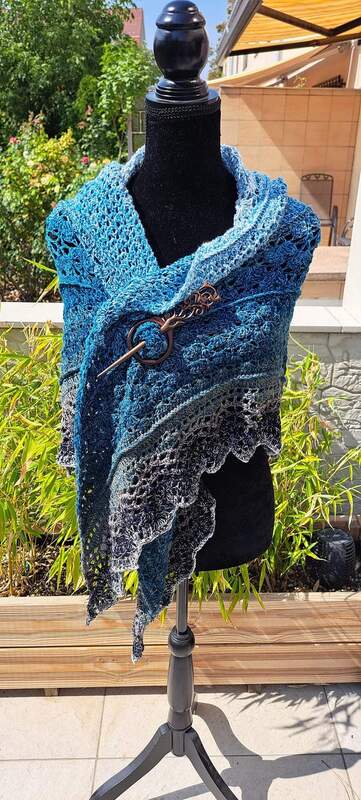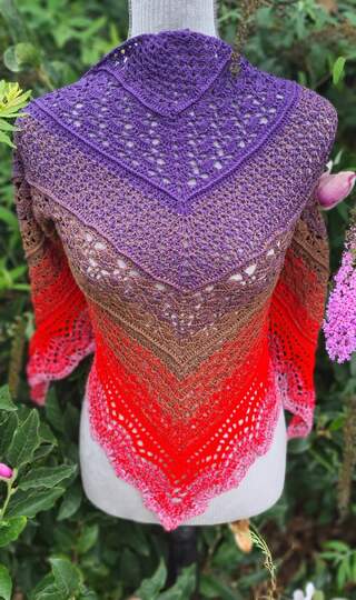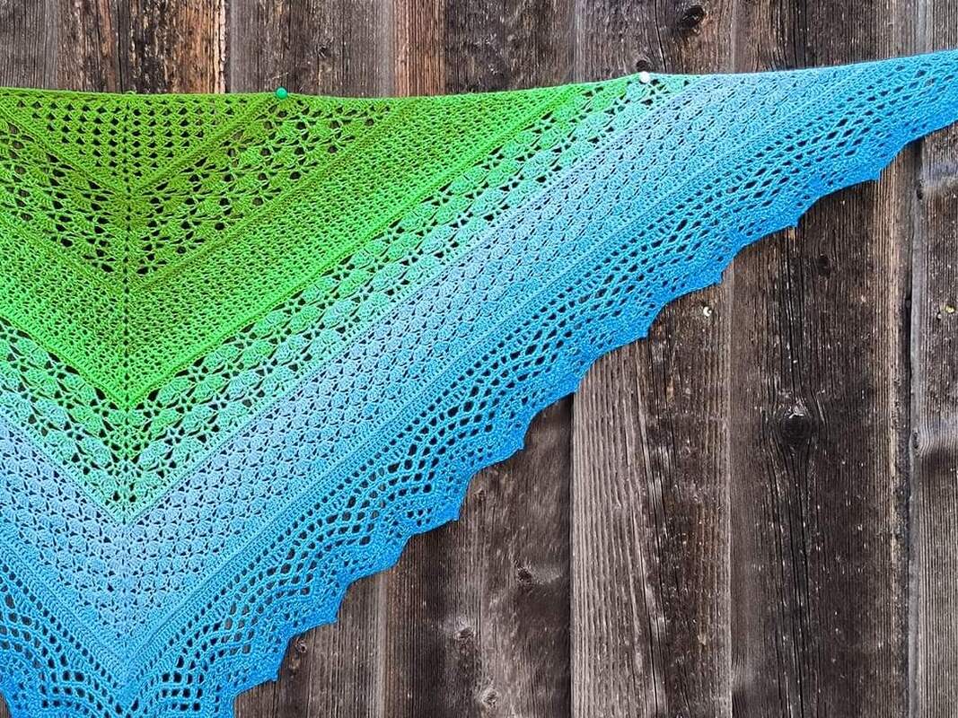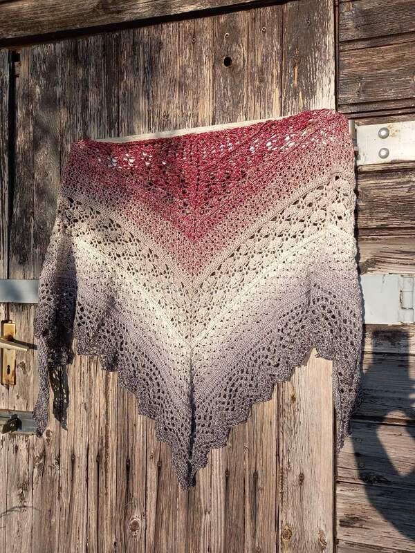 Es kann mit jedem gewünschten Garn gehäkelt werden, ich würde dazu einen Farbverlaufsbobbel empfehlen. Mein Tuch ist aus dem Bobbel Sheherazade von Kandelas Handarbeitsbox.