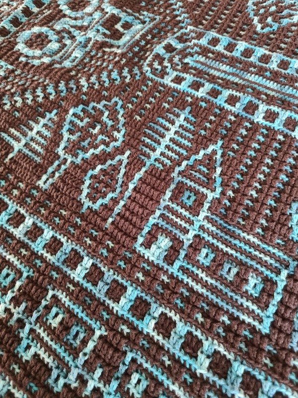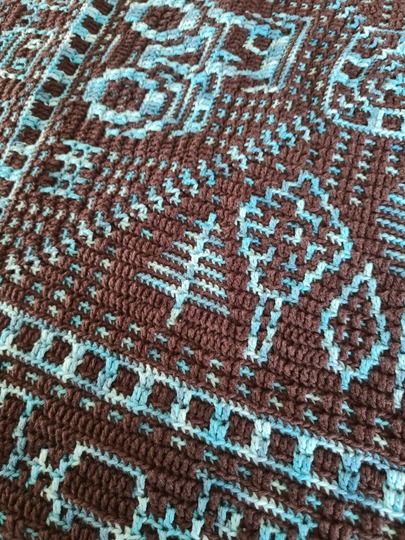 Die beige-braune Decke wurde mit ähnlicher Wolle testgehäkelt.