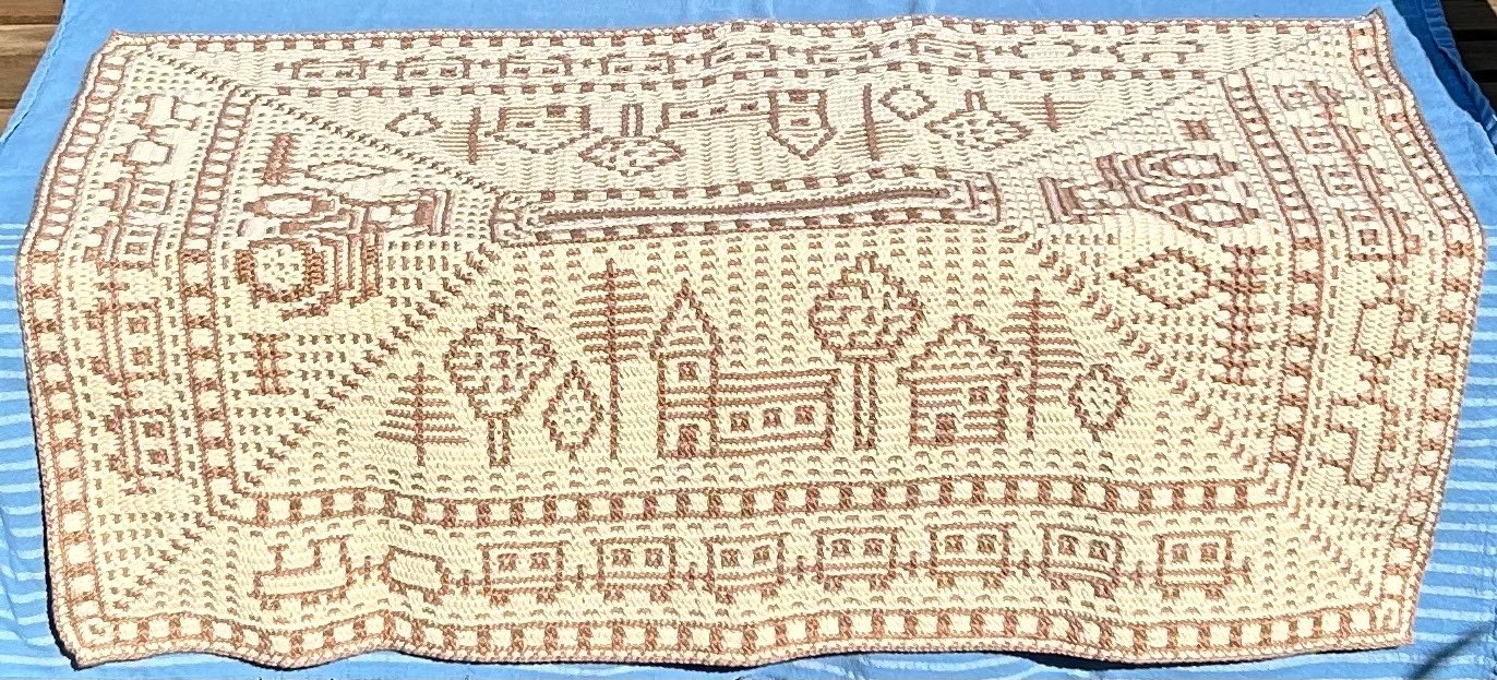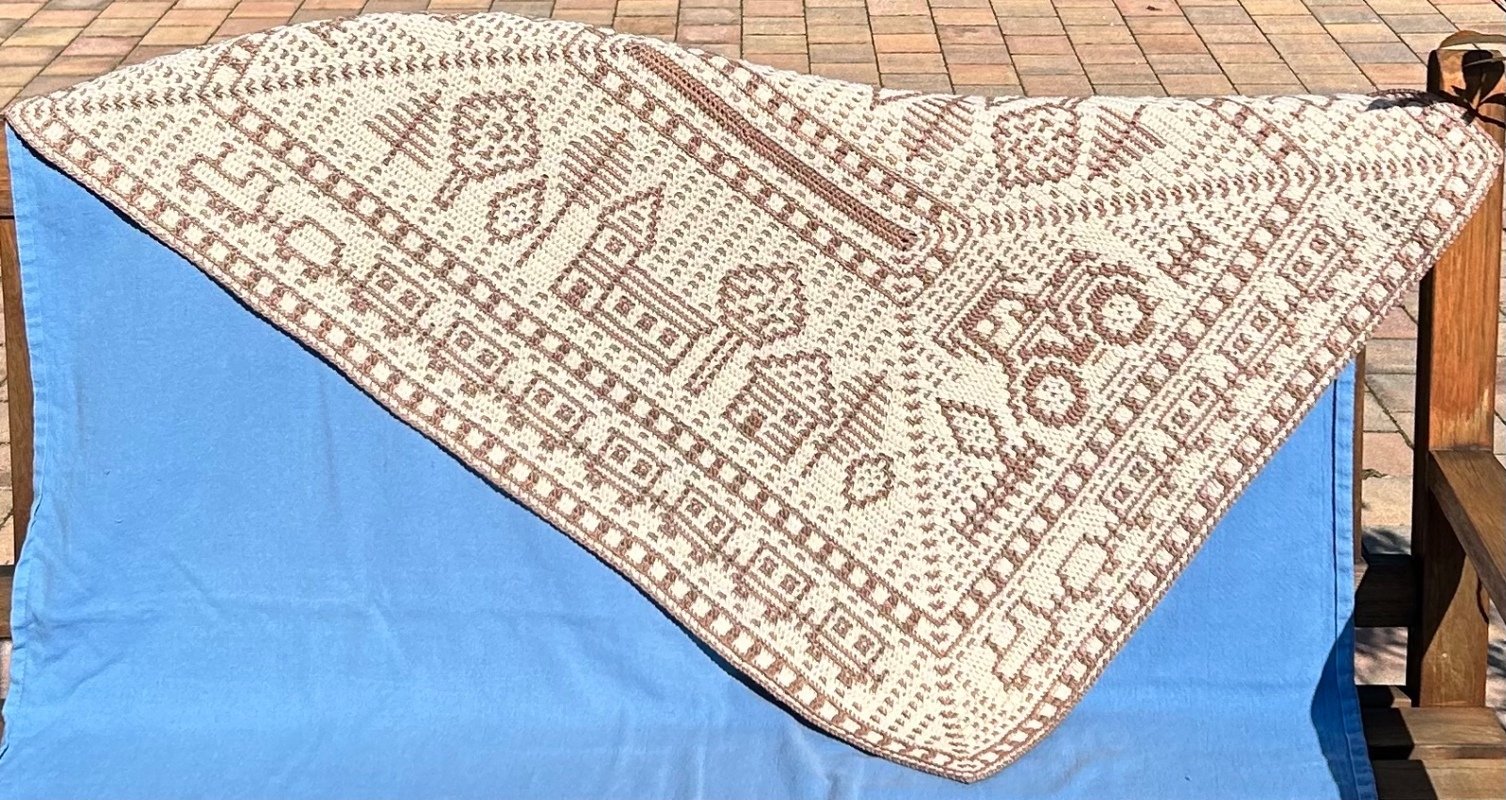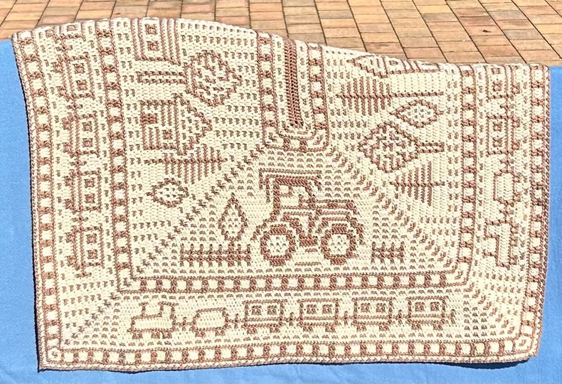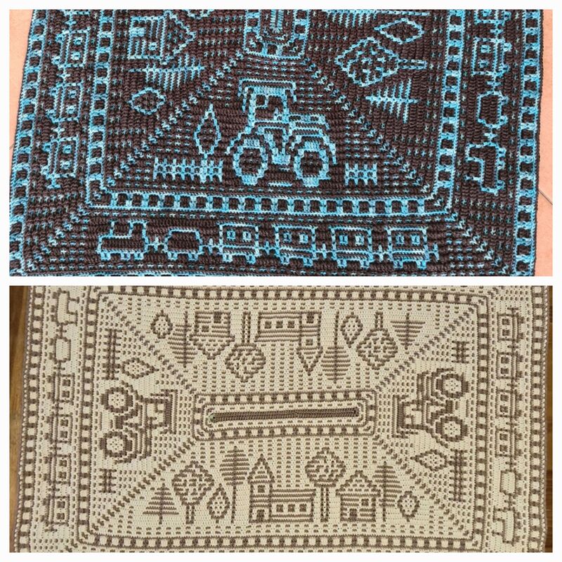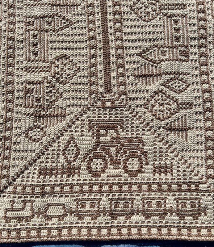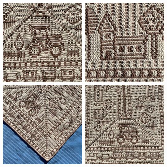 Diese schöne Kinderdecke Country Life wird von der Mitte aus in Runden mit der Overlay-Mosaiktechnik gearbeitet.
