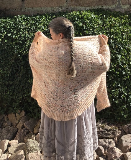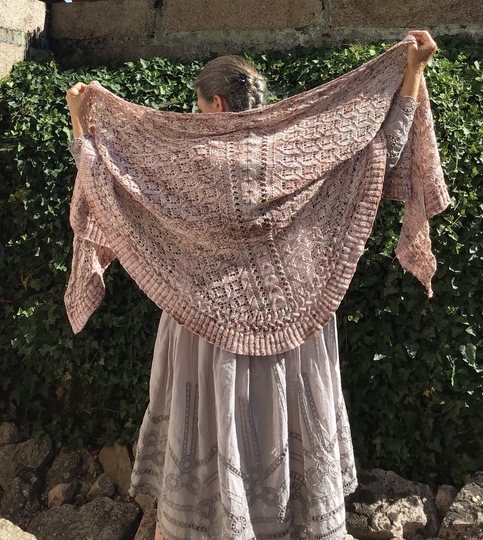Das Rosengarten Tuch ist ein großes Dreieckstuch, dessen Muster an aufblühende Rosen erinnert. Die Borte bildet ein „offenes“ Zopfmuster, das durch Umschläge einen plastischen Charakter bekommt und ein Rosenspalier darstellen soll.