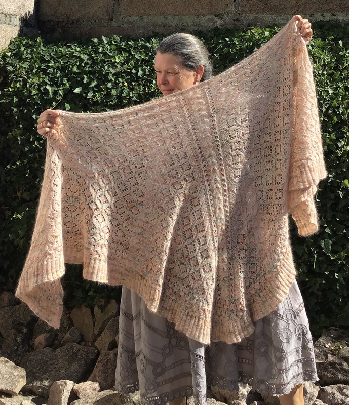 Die Größe des Tuches ist abhängig von dem gewählten Garn. Die Mohair und Sportgewicht Versionen ergeben ein sehr großes Tuch mit folgenden Maßen: 112 cm hoch, gemessen entlang der Mitte, 270 cm Spannweite, gemessen von Spitze zur Spitze.