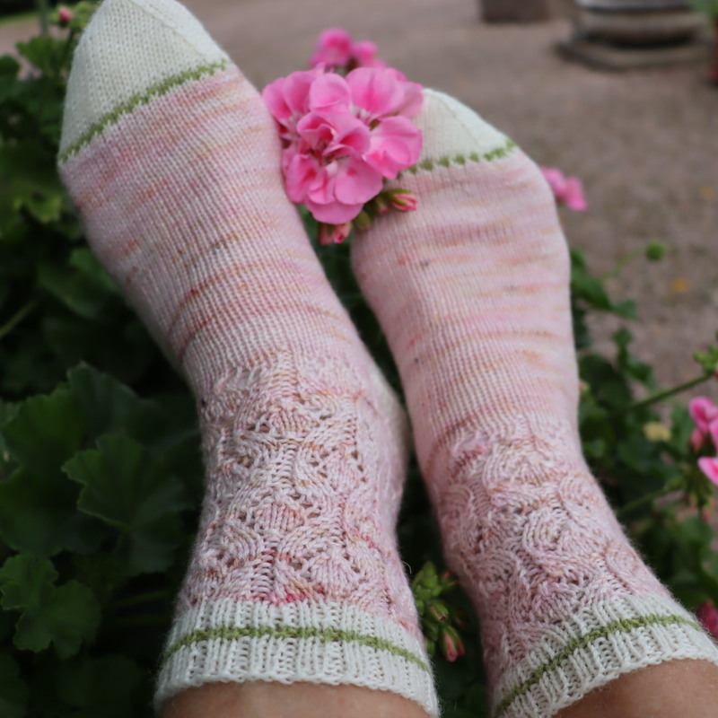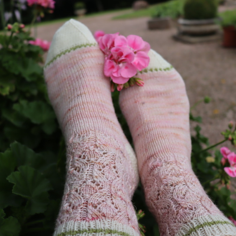 Die Rosengarten Socken verdanken ihren Namen dem Muster, das an aufblühende Rosenknospen erinnert.