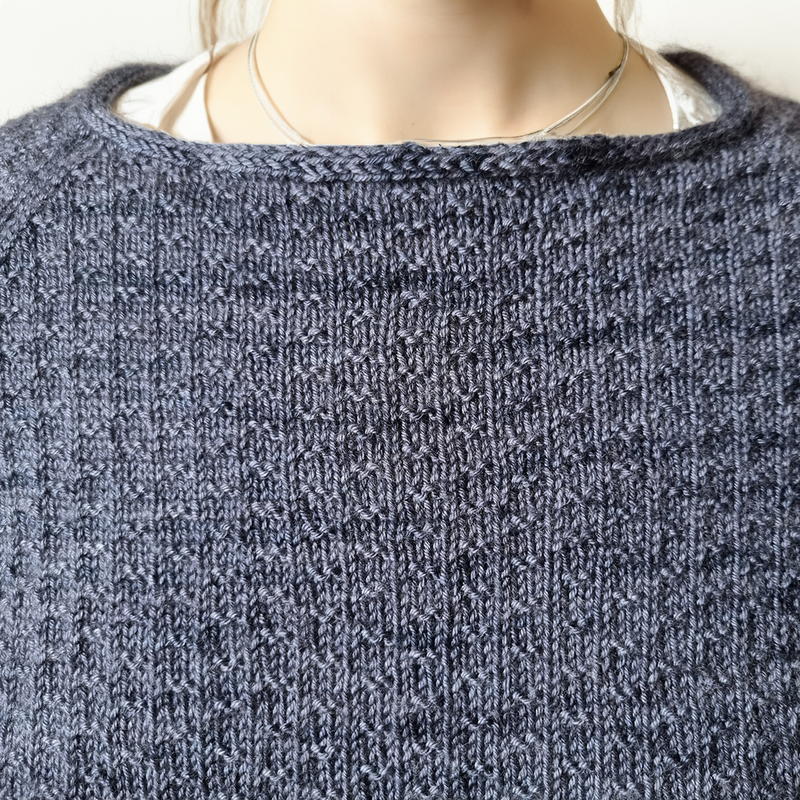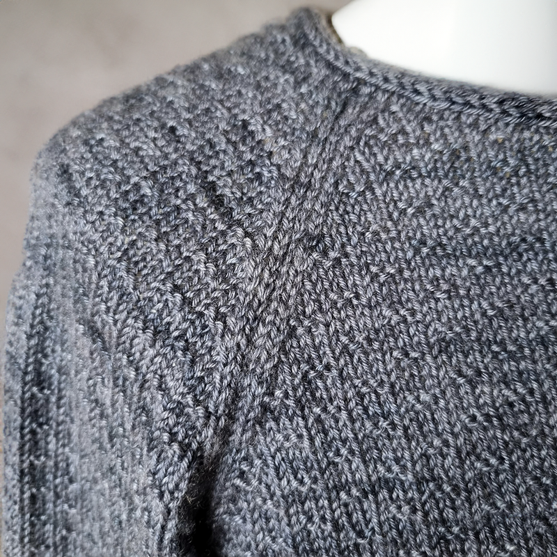 Gestrickt wird dieser Pullover von unten nach oben in Einzelteilen, die am Ende zusammengenäht werden. Man beginnt zunächst mit dem Rückenteil einschließlich der Raglanschrägen, dann folgen das Vorderteil und die Ärmel. Am Ende werden die Ärmel entlang der Raglanlinien an Vorder- und Rückenteil genäht, die Seiten- und Ärmelnähte geschlossen und das Halsbündchen angestrickt.