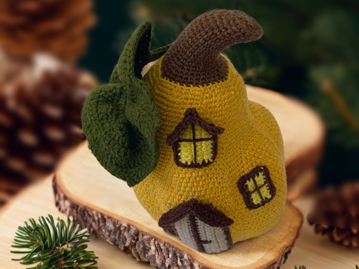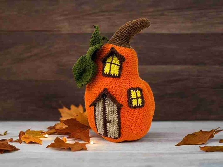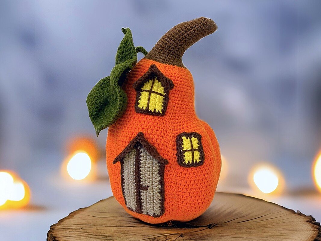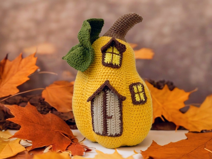 Kürbishaus häkeln. Langer Kürbis, Butternut-Typ. Halloween-Dekoration.