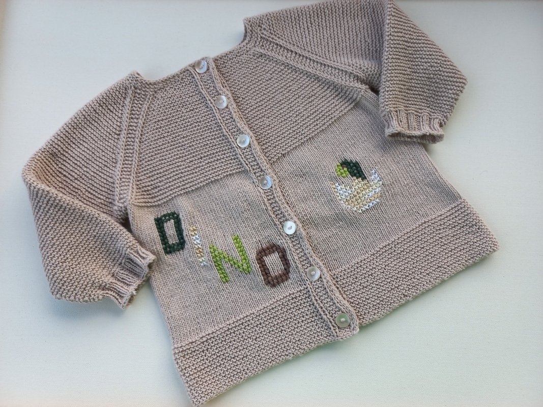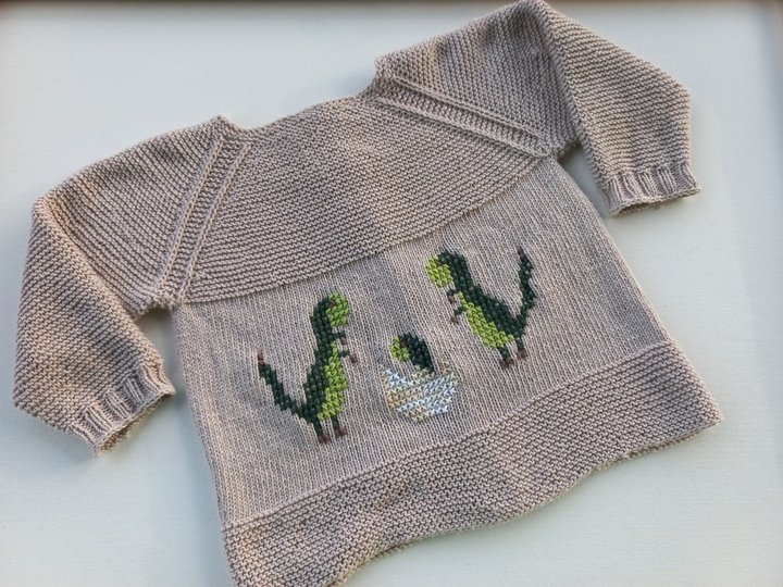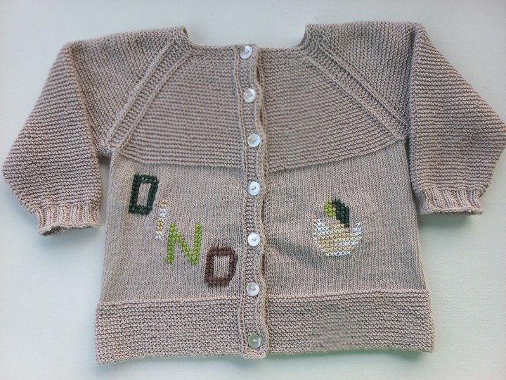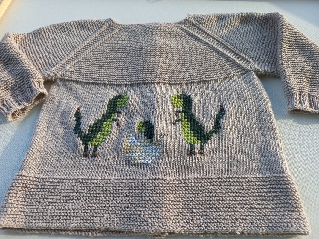 Die Highlights dieses Jäckchens sind die Dino-Motive, die ich eingestickt habe (alle Motive sind in der Anleitung genau aufgezeichnet), durch sie wird die an sich schlichte Jacke so richtig aufgepeppt.