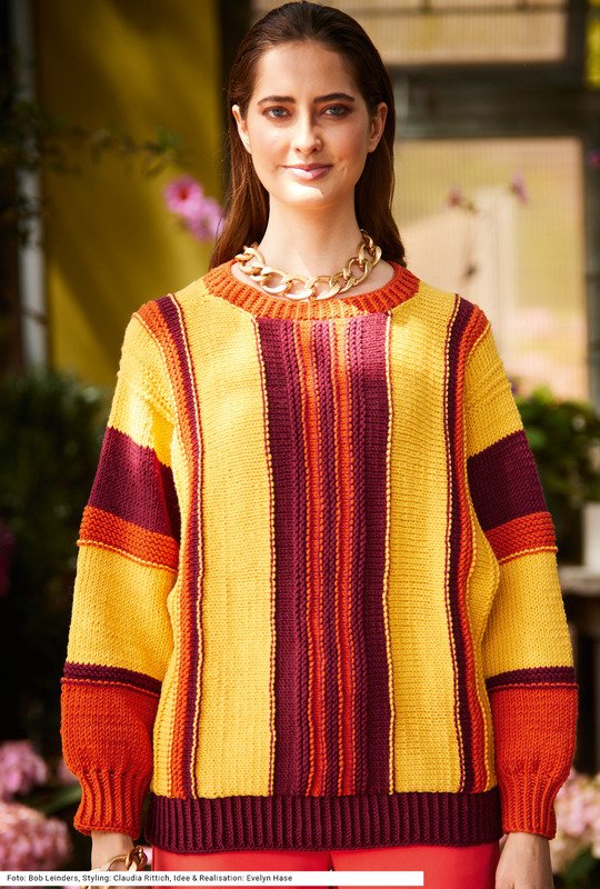 Im Stil der 80er-Jahre kommt dieses Modell daher: Der Pullover mit Fledermausärmeln ist typischerweise weit geschnitten und wird in einem Stück quer von Ärmel zu Ärmel gearbeitet. Die Streifen werden glatt rechts und kraus rechts bzw. kraus links in einer herrlichen Herbst-Farbkombi in Gelb, Weinrot und Orange gestrickt. Die Rippenbündchen mit rechts verschränkten und linken Maschen schließen die Ärmel schmal ums Handgelenk. Diese Rippen sind auch am Bund und an der Halsausschnittblende zu sehen. Eine Anleitung für ein Garn aus Schurwolle und Polyacryl gibt es für die Größen 38/40, 42/44 und 46/48.