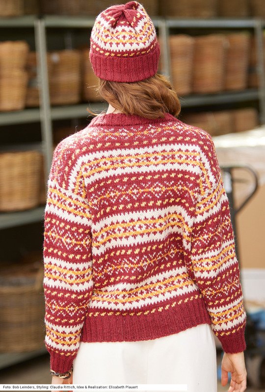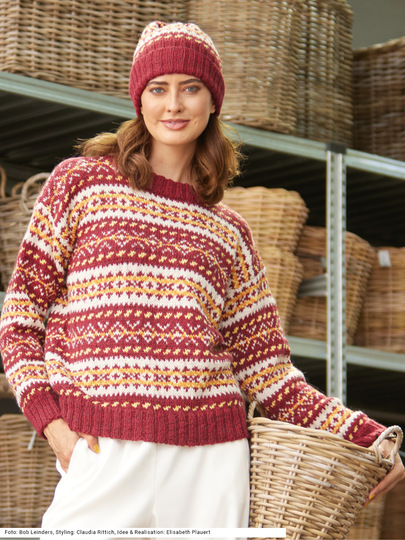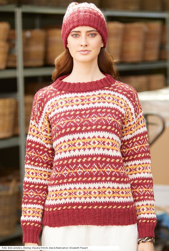 In diesem Pulli plus Mütze, beides mit Norwegermuster, fühlst du dich rundum wohl. Das Garn aus Alpaka und Schurwolle ist so kuschelig, dass du dieses Set am liebsten den ganzen Tag tragen willst. Die Mütze hat einen breitem Rippen-Umschlag; diese 2/2-Rippen in Bordeaux hat auch der Pulli an den Bündchen und der Ausschnittblende. Vorder- und Rückenteil werden bis zu den Armausschnitten in Runden gearbeitet. Das Jacquardmuster wird in Bordeaux, hellem Beige, Gelb und Orange gearbeitet. Eine Anleitung gibts für die Größen 38/40, 42/44 und 46/48; Mütze: 52 – 56 und 58 – 62 cm Kopfumfang.