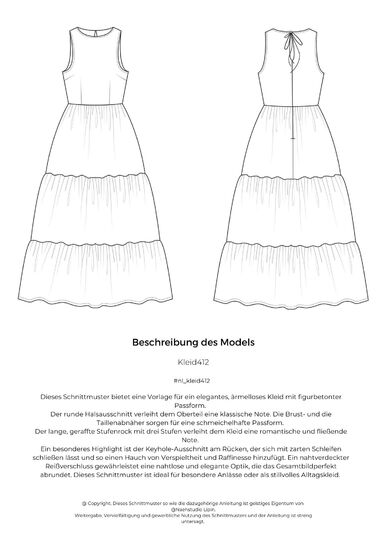Dieses Schnittmuster bietet eine Vorlage für ein elegantes, ärmelloses Kleid mit figurbetonter Passform.