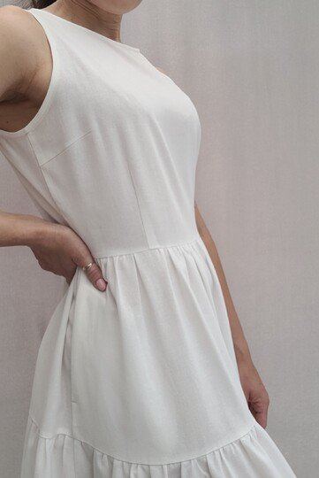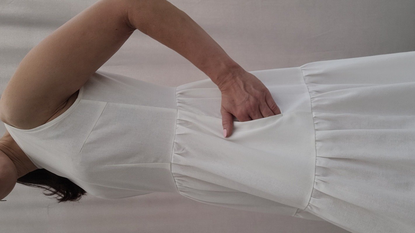 Ich trage auf dem Bild das Kleid in Größe 40, bei der Körpergröße 165 cm. Das Kleid wurde aus Viskose-Leinen genäht.