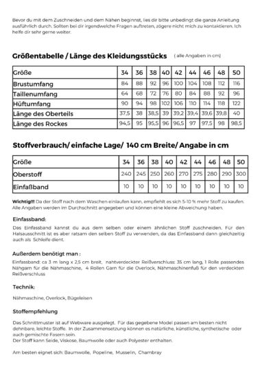 Das Schnitmuster für dieses Kleid beinhaltet 9 EU-Größen: 34 - 50
