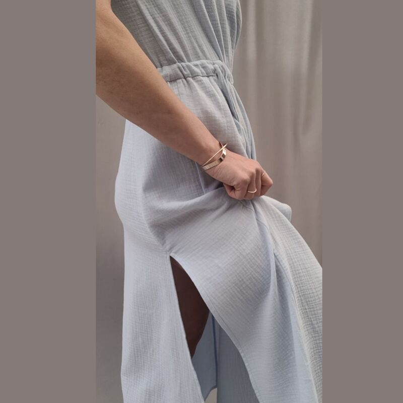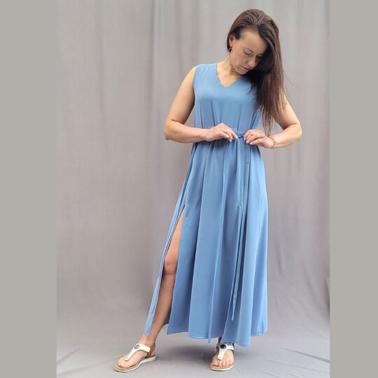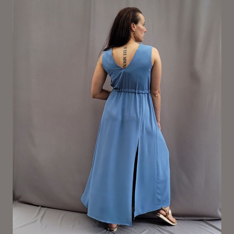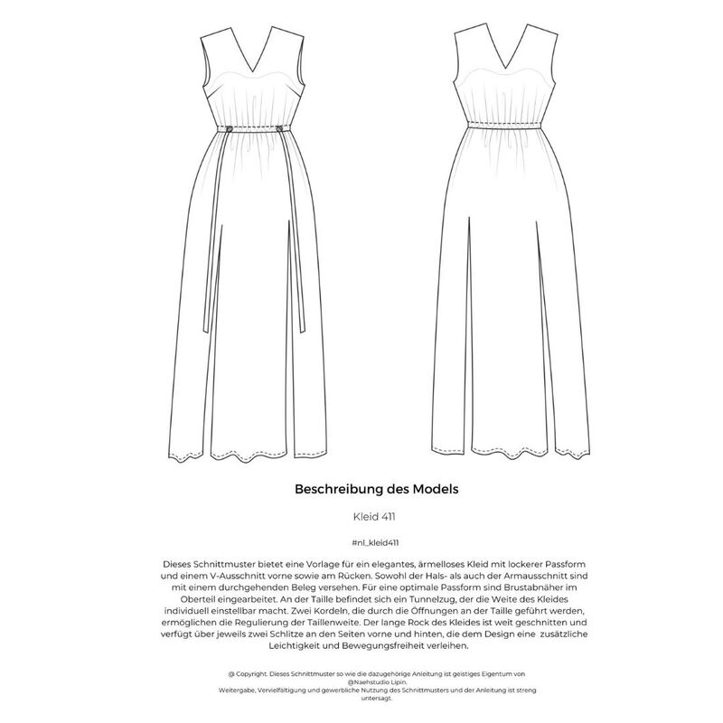 Dieses Schnittmuster bietet eine Vorlage für ein elegantes, ärmelloses Kleid mit lockerer Passform und einem V-Ausschnitt vorne sowie am Rücken. Sowohl der Hals- als auch der Armausschnitt sind mit einem durchgehenden Beleg versehen. Für eine optimale Passform sind Brustabnäher im Oberteil eingearbeitet. An der Taille befindet sich ein Tunnelzug, der die Weite des Kleides individuell einstellbar macht. Zwei Kordeln, die durch die Öffnungen an der Taille geführt werden, ermöglichen die Regulierung der Taillenweite. Der lange Rock des Kleides ist weit geschnitten und verfügt über jeweils zwei Schlitze an den Seiten vorne und hinten, die dem Design eine zusätzliche Leichtigkeit und Bewegungsfreiheit verleihen.