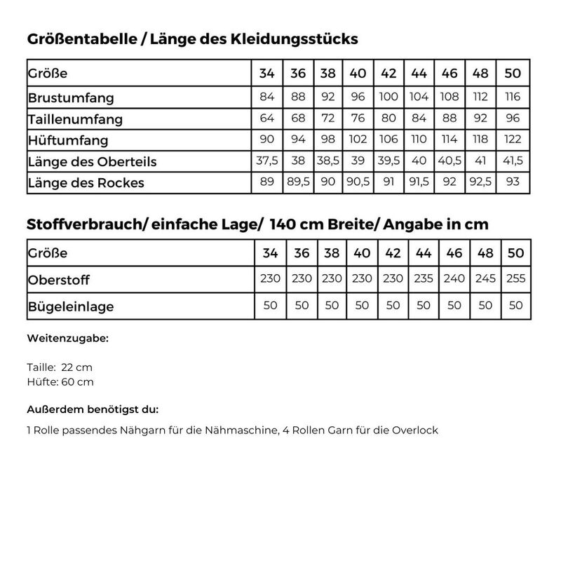 Die Tabellen mit Größenangaben und Stoffverbrauch findest du in der Galerie. Beachte bitte, dass die Angaben zum Stoffverbrauch nur Richtwerte sind. Der Verbrauch aller zusätzlichen Materialien wird im Durchschnitt angegeben.