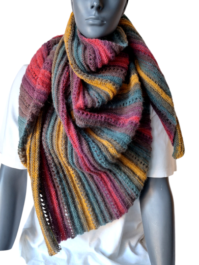 Das fertige Tuch hat mit der angegebenen Wolle eine Größe von ca. 180 x 110 cm, kann jedoch beliebig größer gestrickt werden.