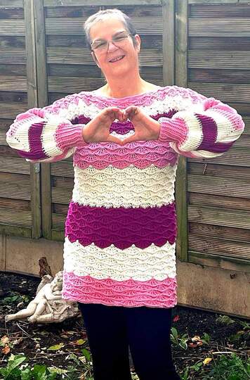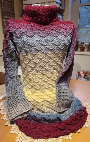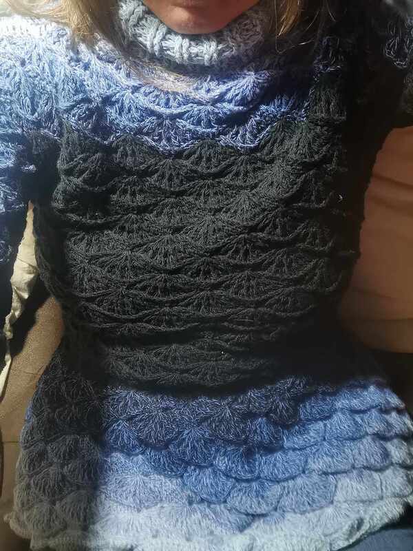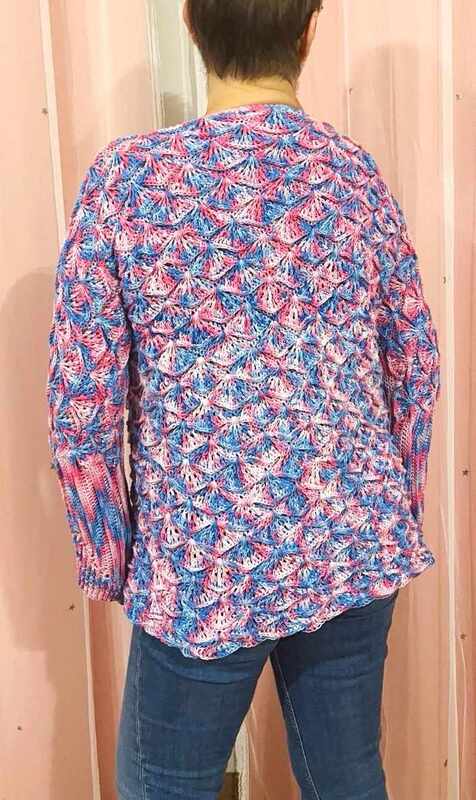 Er wird inklusive der Ärmel komplett in einem Stück gehäkelt.