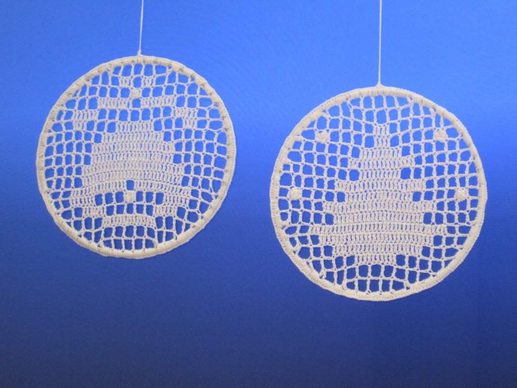 Eine Häkelanleitung mit den allgemeinen GRUNDLAGEN für Fensterbilder im Filet-Muster, die Häkelanleitung zum Fensterbild GLOCKE und die Häkelanleitung zum Fensterbild BAUM.