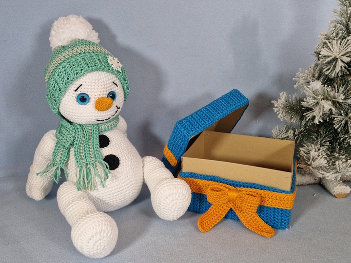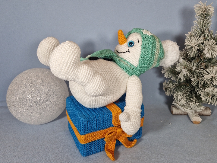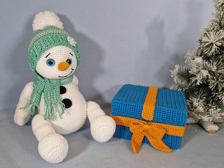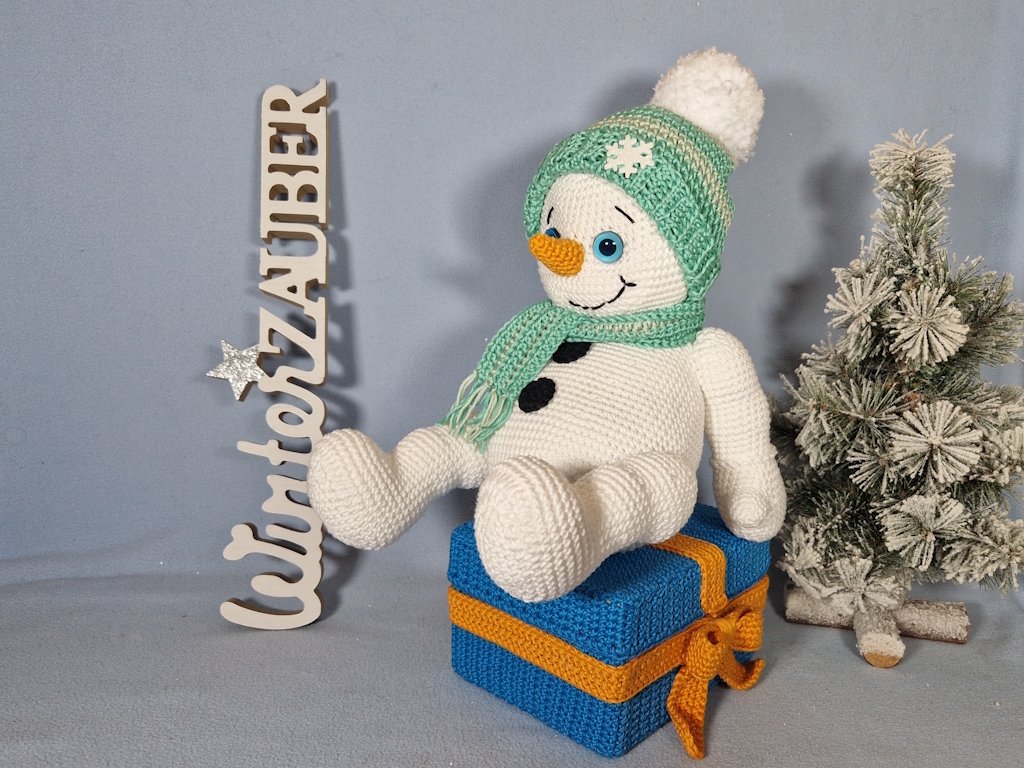 Die Größe von Geschenkbox und Schneemann liegt insgesamt ca. bei 30 cm in der Breite und 40 cm in der Höhe.