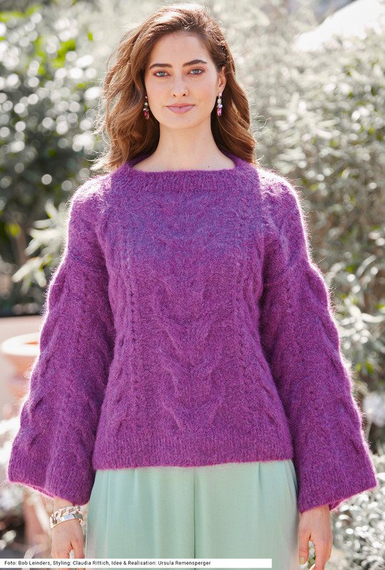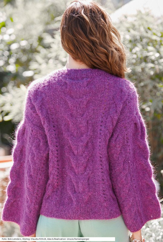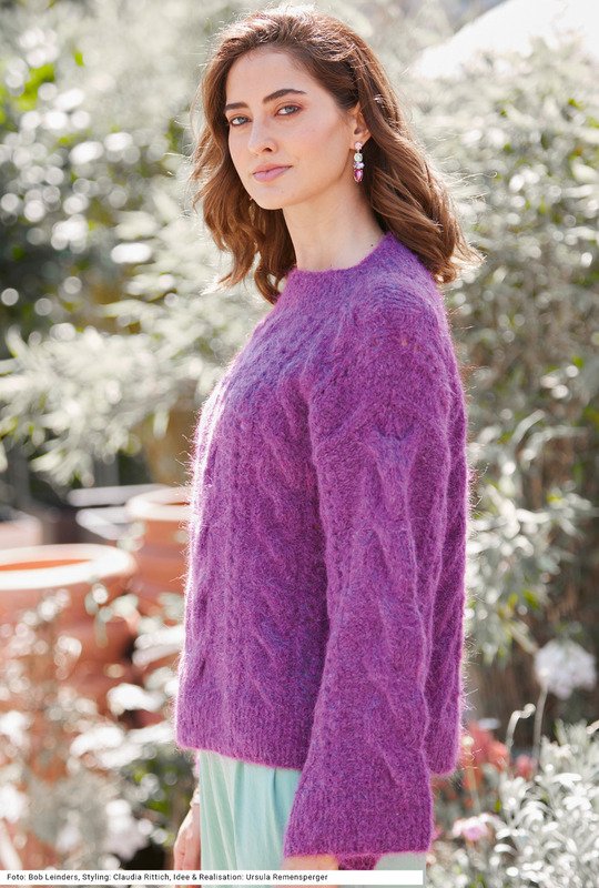 Starke Farbe, starkes Muster – so könnte man den flauschigen Pulli kurz beschreiben. Er hat einen lässigen geraden Schnitt mit extraweiten Ärmeln. Ergänzt wird der dynamische Look durch die schwungvollen, mal breiten, mal schmalen Zopfmuster, das dem Modell seine Ausdrucksstärke verleiht. Zwischen den Zöpfen verläuft ein Strang aus einem schmalen Lochmuster und glatt linken und glatt rechten Flächen. Die Weichheit des rotvioletten Garns kommt vom hohen Anteil an Baby-Alpaka, dem noch etwas Polyamid beigemischt ist. Die Anleitung kann für die Größen 38/40, 42/44) und 46/48 downgeloadet werden.