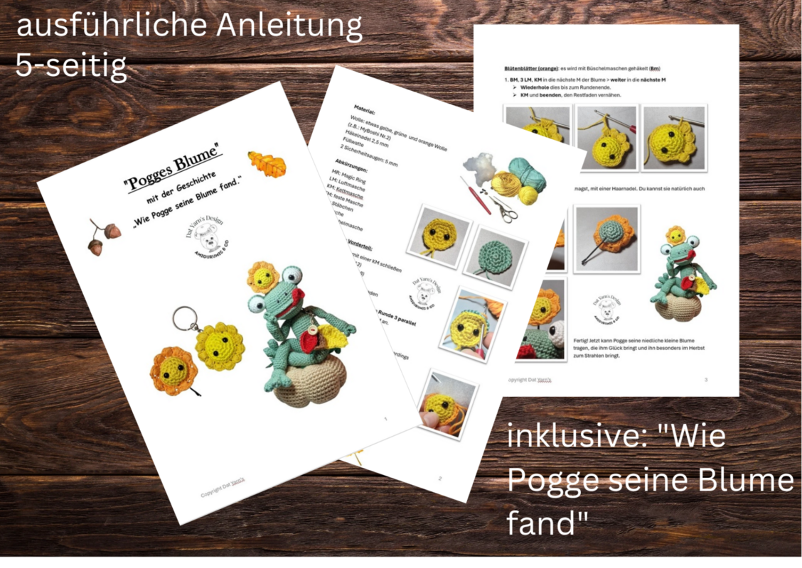 Diese fröhliche kleine Blume ist das perfekte Accessoire für Pogge, den Frosch, und bringt einen Hauch von Natur in dein Häkelprojekt. Mit ihren schlichten, weichen Blütenblättern und einem schmalen Körper, der Pogges Kopf liebevoll umarmt, verleiht sie ihm seinen ganz besonderen Charme. Ob als Deko auf Pogges Kopf, als Schlüsselanhänger oder sogar als Haarschmuck für kleine Mädchen – diese Blume ist vielseitig einsetzbar und schnell gehäkelt. Ideal für alle, die kleine, süße Häkelprojekte lieben und nach einer einfachen, aber effektvollen Dekoration suchen!
