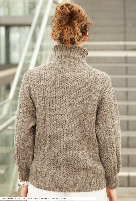 Dieser sportliche graubraune Pullover mit bequemen weiten Ärmeln ist ein Fest für alle, die gerne abwechslungsreiche Muster stricken. Das Modell vereint verschieden breite Zopfmuster, außen Perlmuster und in der Mitte ein Wabenmuster auf eine harmonische Art und Weise. Alle Bündchen und der mal als Stehkragen, mal als Rollkragen zu stylende Kragen sind im 2/2-Rippenmuster gearbeitet. Das Garn aus Schurwolle, Alpaka und Polyamid gibt es auch in anderen grau-braunen Farbtönen und vielen leuchtenden Farben. Eine Anleitung steht für die Größen 36/38, 40/42 und 44/46.zur Verfügung.