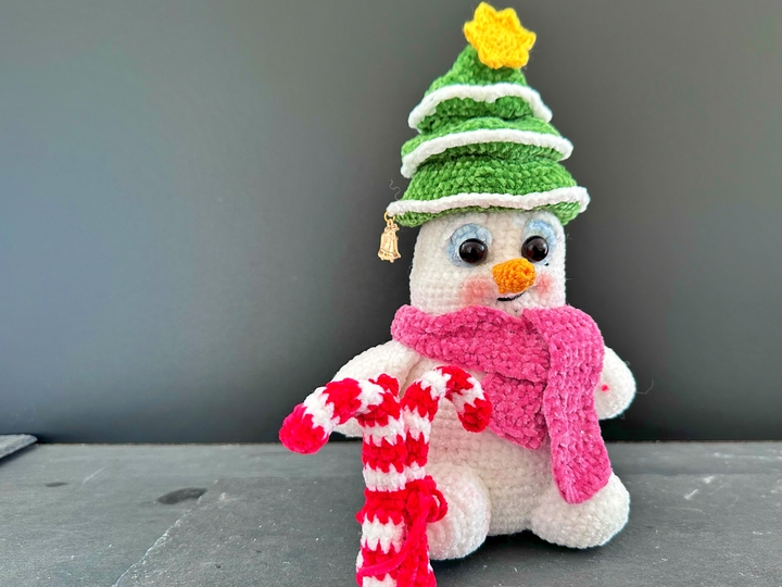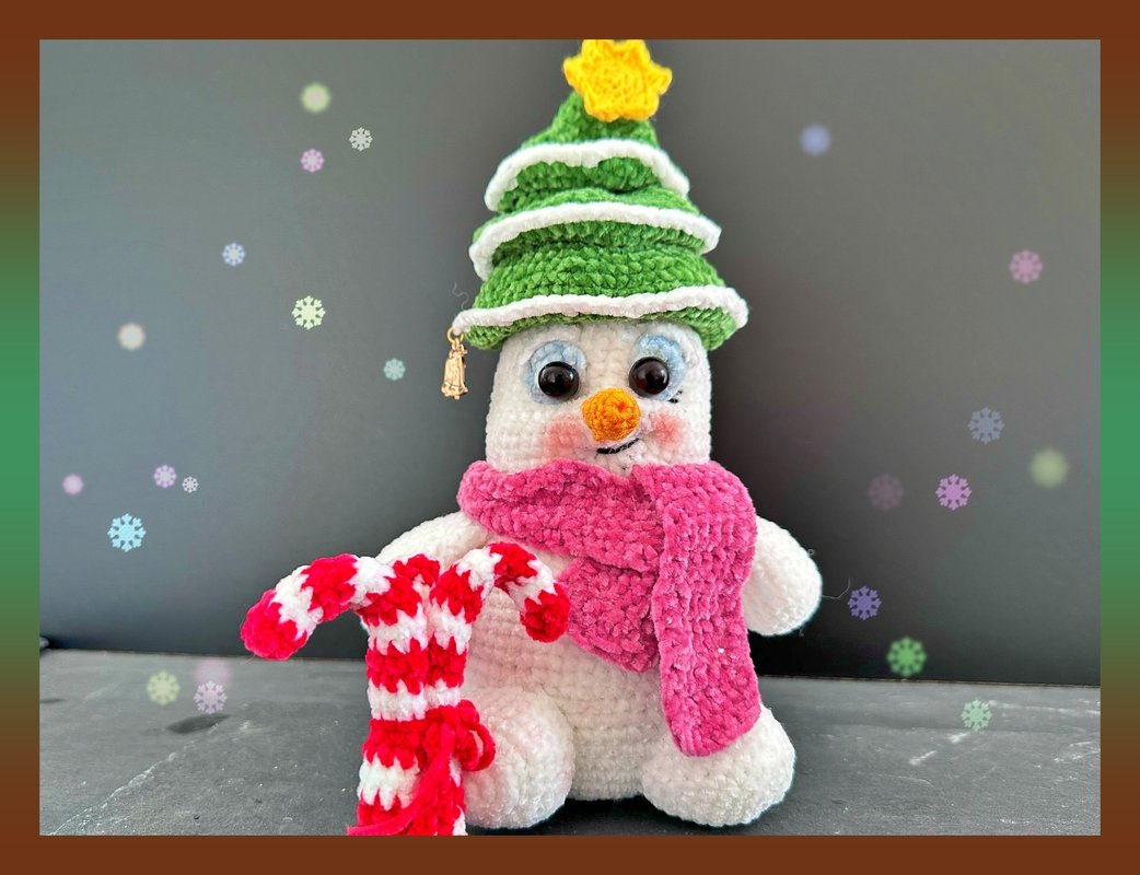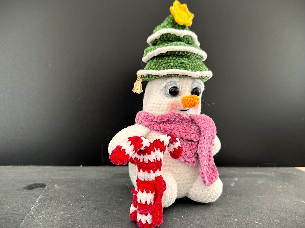 Ihr kauft hier eine Häkelanleitung als PDF für einen Schneemann mit einem Hut in Form eines Weihnachtsbaumes und Zuckerstangen.