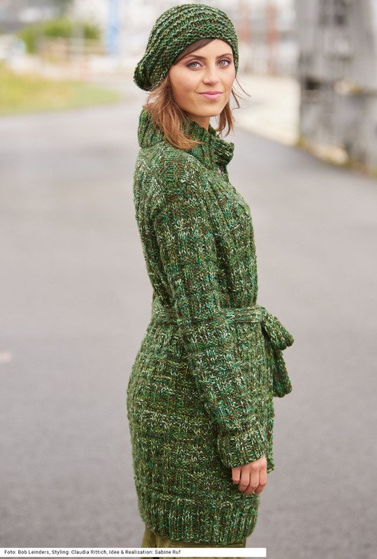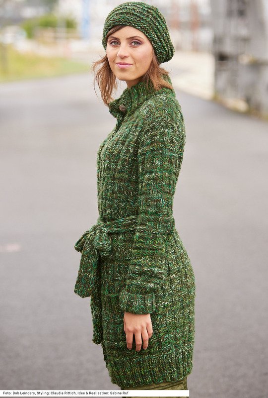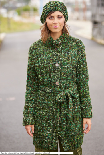 Diese lange Jacke mit Bindegürtel aus einem dicken Schurwollgarn kann sowohl lässig-natürlich als auch cityfein gestylt werden. Die passende Mütze ergänzt den kernig-kraftvollen Look. Durch das Strukturmuster aus rechten und linken Maschen und dem grün-braun melierte Garn bekommt das Duo seine besondere Ausdruckskraft. Zwei mitgestrickte Eingrifftaschen haben genug Platz, um sich auch mal die Hände zu wärmen. Eine Anleitung steht für die Größen 38/40 und 46/48 und für die Mütze mit 55 – 57 und 58 – 60 cm Kopfumfang zur Verfügung.