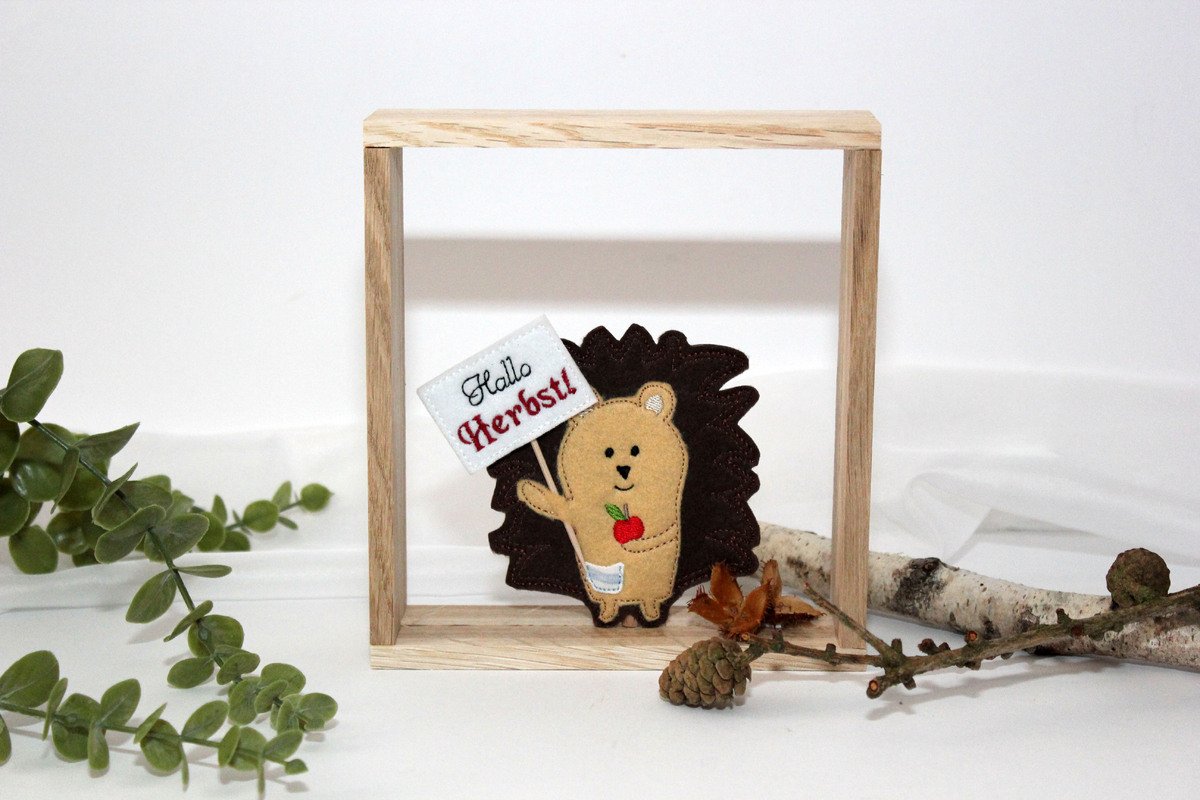 Der kleine Igel ist ganz begeistert vom Herbst und sammelt fleißig Äpfel! Das Kerlchen hat an der Unterseite eine Öffnung, durch die ein Ast oder Stäbchen geführt werden kann. So kann er als Blumenstecker oder als Deko in Leisten aus Klötzchen oder in einem Steckschwamm seinen Platz finden. Dazu gibt es jeweils passend einen Korb vollApfel in der Wiese und ein Schild mit dem Text "Hallo Herbst". Das Schild wird mittels eines Zahnstochers durch den Arm in die Tasche des Igels angebracht.