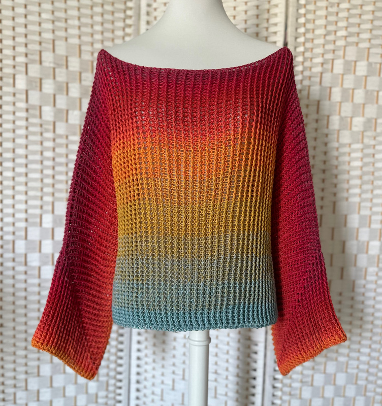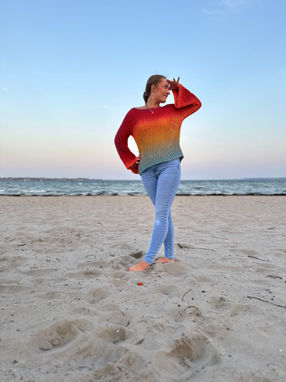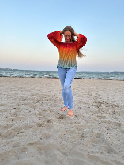 Je nach Garnauswahl, kann man den Pullover in jeder Jahreszeit tragen. Besonders gut eignen sich hier Farbverlaufsgarne, weil er mit einem Rutsch von der Häkelnadel hüpft.