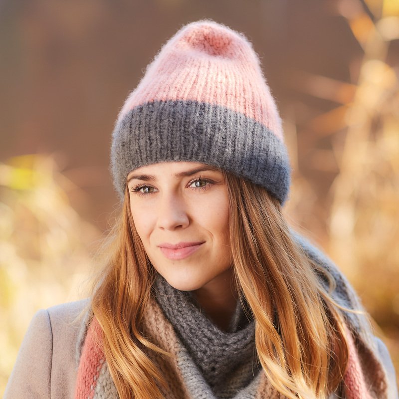 Nadeln: Stricknadeln 10 mm bzw. die Größe, mit der die richtige Maschenprobe erreicht wird. Die Mütze lässt sich am einfachsten auf einem Nadelspiel in Runden stricken.