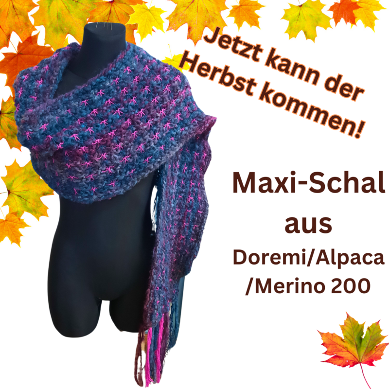 Der Schal ist schön maxi, er ist ca. 200 cm lang und 35 cm breit, mit noch mehr Potential nach dem Spannen.