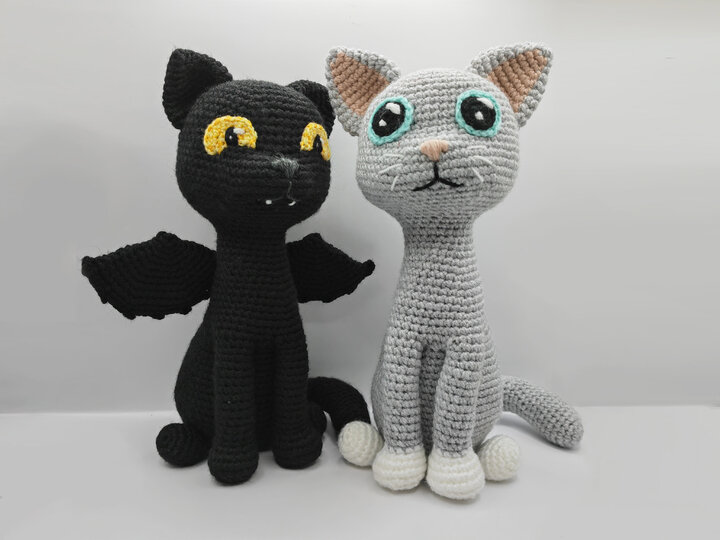 Die niedliche Katze im Comicstil kann als normale Katze oder Vampirkatze mit Flügeln gehäkelt werden.