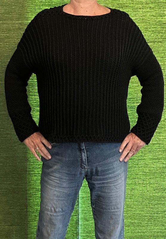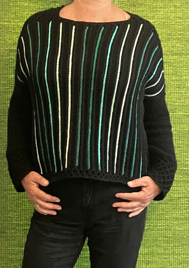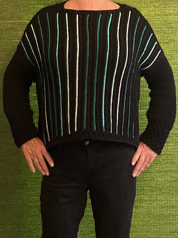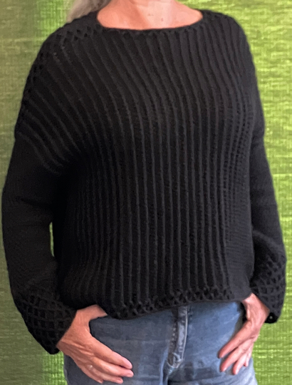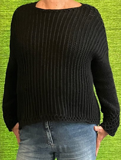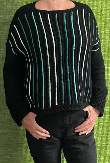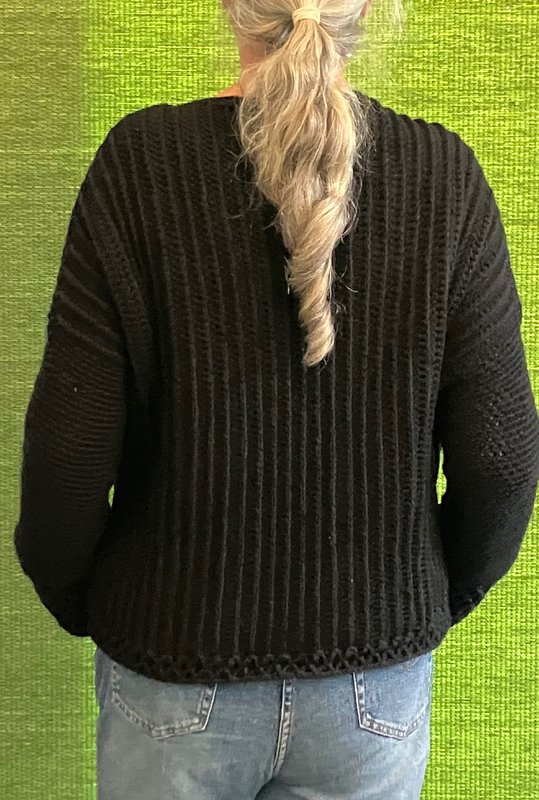 Das plastisch wirkende Muster habe ich so gewählt, dass es maximal die Wärme speichern kann. Die Rippen bilden sozusagen eine zweite Schicht. Ich habe ihn modisch kurz gehalten (du kannst ihn natürlich problemlos länger machen). Der Schnitt ist wieder einer meiner „Bauchwegschummler“: Das Shirt fällt so über den Bauch, dass er ihn nicht „abbildet“ sondern kaschiert. Nach dem Motto: ob da ein Bauch oder pure Luft darunter ist, sieht man nicht auf den ersten Blick