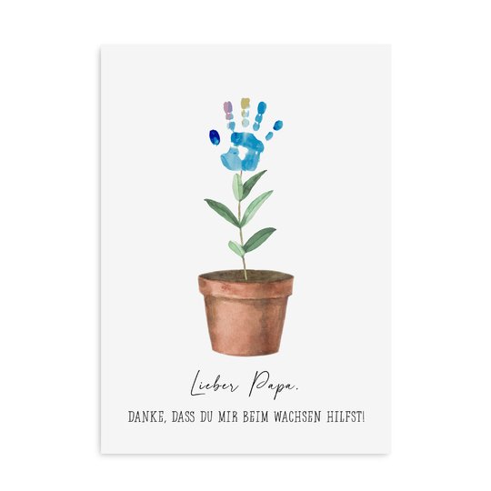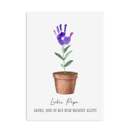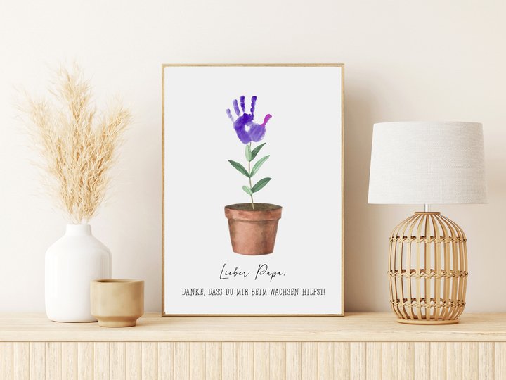 Druck es Dir in dem gewünschten Format zu Hause aus und dann lass Dein Kind einen Handabdruck auf das Poster drucken. Der Handabdruck Deines Kindes ist dann die Blüte der Pflanze.