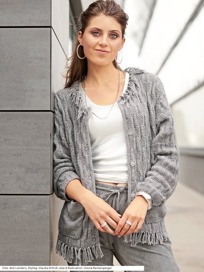 Diese Jacke mit Druckknöpfen ist perfekt für Tage im Office. Die aufgesetzten Taschen werden glatt rechts, ansonsten wird ein Reliefmuster aus rechten und linken Maschen gestrickt. Zunächst muss man aufpassen, dass man die Maschen nicht verwechselt, jedoch mithilfe der Strickschrift ist das kein Problem und nach ein, zwei Höhenrapporten kann man das Muster auswendig. An Saum und Halsausschnitt sind Fransen eingeknüpft. Das graumelierte Garn setzt sich aus Baumwolle, Polyacryl, Polyester, Schurwolle und Viskose zusammen. Für die Größen 38/40, 44/46 und 48/50 gibt es eine Anleitung.