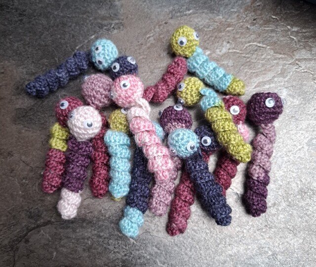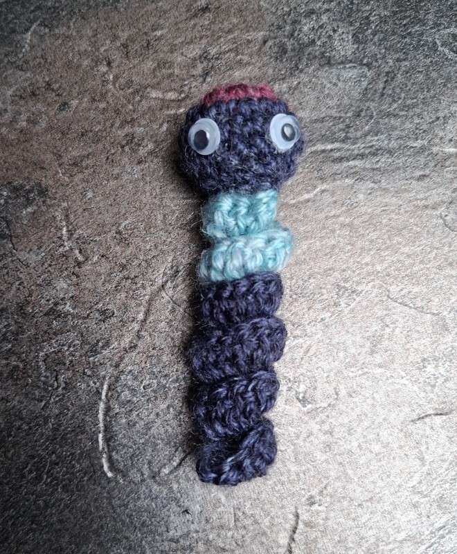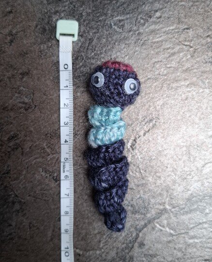 Der Kopf des Würmchens wird einen Durchmesser von ca. 2cm haben und der Schwanz eine Länge von ca. 6-7cm. Die genaue Größe kann variieren, je nachdem, was für ein Garn du verwendest.