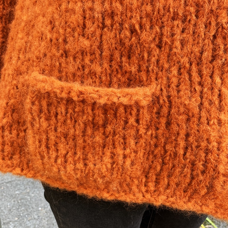 Diese leichte, kuschelige Jacke wird von unten nach oben gestrickt und zeichnet sich durch ihre schlichte Form mit Taschen aus. Der Cardigan verfügt über einen Stehkragen sowie ein glatt rechts gestricktes Bündchen und gerade Ärmel. Besonders hervorzuheben ist der vollständige Abschluss mit einem I-Cord-Rand sowie die vordere Blende inklusive des Stehkragens.