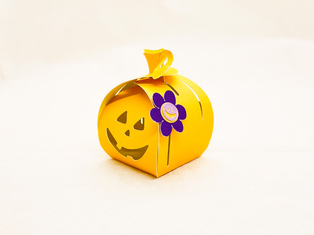 Plotterdatei bzw. pdf-Vorlage für eine Geschenkbox Kürbis mit lachendem Gesicht und Blume
