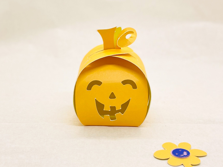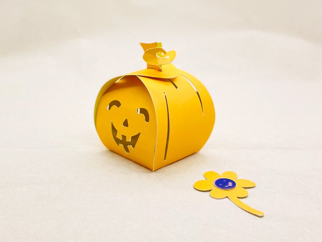 Plotterdatei bzw. pdf-Vorlage für eine Geschenkbox Kürbis mit lachendem Gesicht und Blume