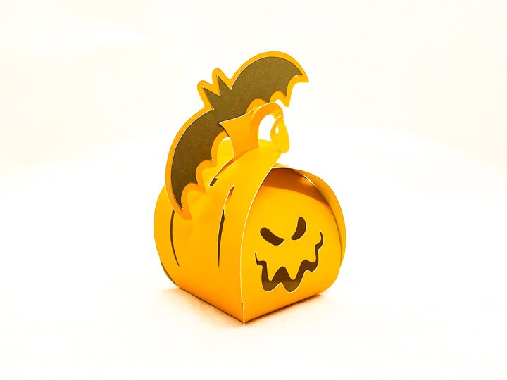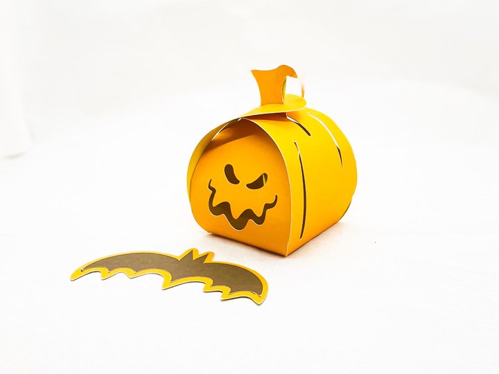 Halloween-Kürbis Geschenkbox Plotterdatei bzw. pdf-Vorlage, Kürbis mit gruseligem Gesicht und Fledermaus