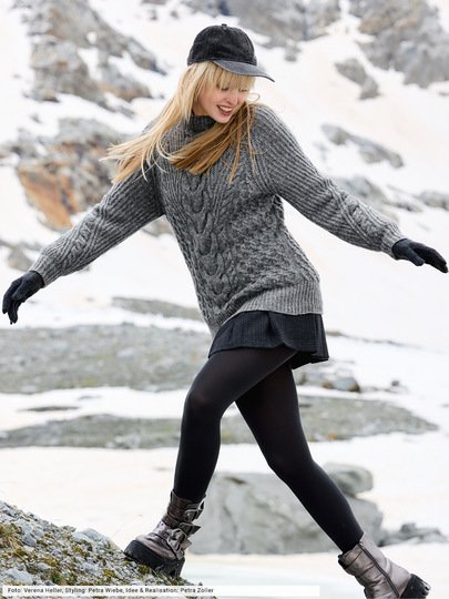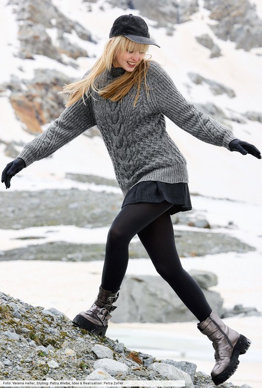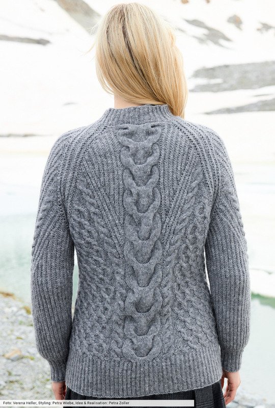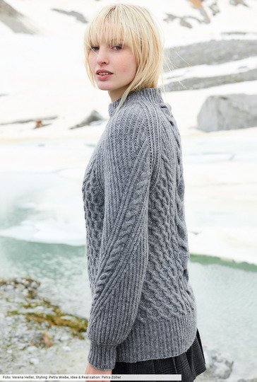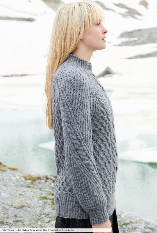 Die Sehnsucht nach Lässigkeit, nach Individualität und nach persönlichen Fashion-Moments, all dies spiegelt die Masche als Lebensgefühl wider. Dazu gehört natürlich auch das Spiel mit Mustern. Hier toll umgesetzt mit markanten Zopf- und Rippenstrukturen und einer Passe, die sich perfekt ausgearbeitet den Raglanschrägungen anpasst. Das griffige Garn aus Schurwolle und Alpaka lässt die Muster toll zur Geltung kommen und schmiegt sich wunderbar weich und warm an die Körperkonturen.