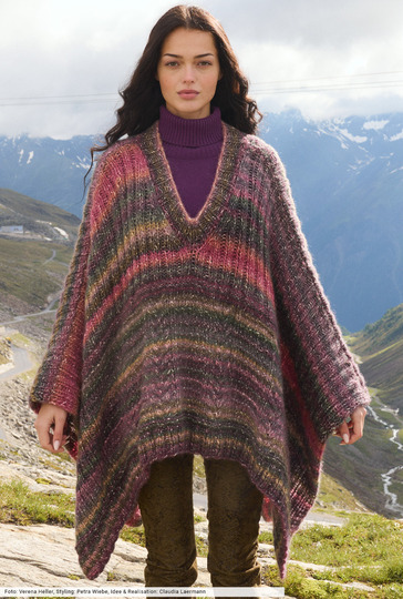 Unkompliziert, bequem und perfekt für ein unvergessliches Statement: Ponchos sind die Helden in dieser Saison. Hier aus einem Farbverlaufgarn, das die Zöpfe und Rippen toll zur Geltung bringt. Ansonsten haben wir auf knifflige Schnittvarianten verzichtet: Du strickst von unten nach oben, mit geraden Kanten, die offen bleiben, und einem V-Ausschnitt, dessen Ränder zum Schluss mit Rippenblenden eingefasst werden.