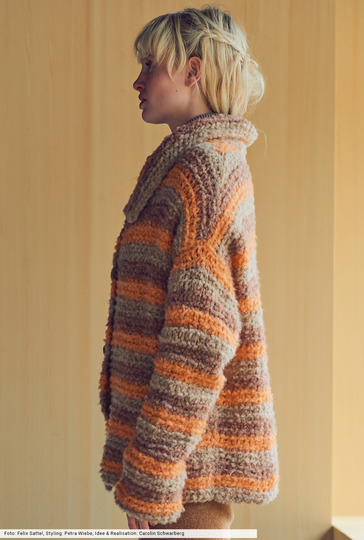 Von Almond über Orange bis hin zu Cinnamon, alles in schlichten Kraus-rechts-Strukturen – so zeigt diese oversize geschnittene Jacke aus weichem Flauschgarn, wie effektvoll man auch mit schlichten Mitteln arbeiten kann. Die Schulterschrägungen sorgen für die perfekte Passform, ein hoher Stehkragen hält die Halspartie schön warm. Das Finish bilden farblich passende Knöpfe, die du direkt bei der Firma bestellen kannst.