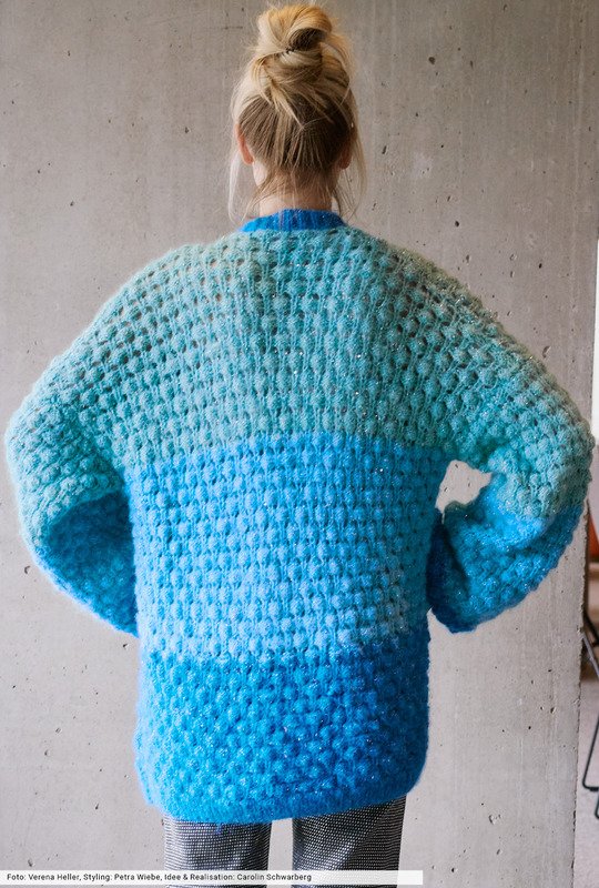 Flauschgarne bieten eine großartige Möglichkeit, jedem Strickteil sofort Charakter zu verleihen. Hier haben wir noch eine glitzerndes Beilaufgarn hinzugefügt, das den Aquatönen allover den prachtvollen Glanz verleiht. Ein markantes Strukturmuster gibt der Masche die spannende Optik und wird in der Anleitung genau beschrieben. Wir lieben diese dreifarbige Jacke, die du dir einfach überziehen kannst und die verschlusslos trotzdem wärmt.