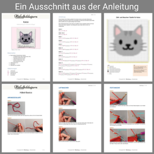 In der Anleitung wird keine Häkelschrift verwendet. Die Maschentabelle ist so gestaltet, dass das Häkeln durch fertig gezählte Maschen erleichtert und beschleunigt wird. Es wird in Reihen und festen Maschen gehäkelt.
