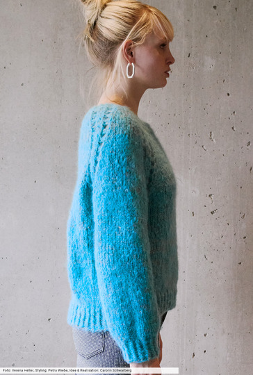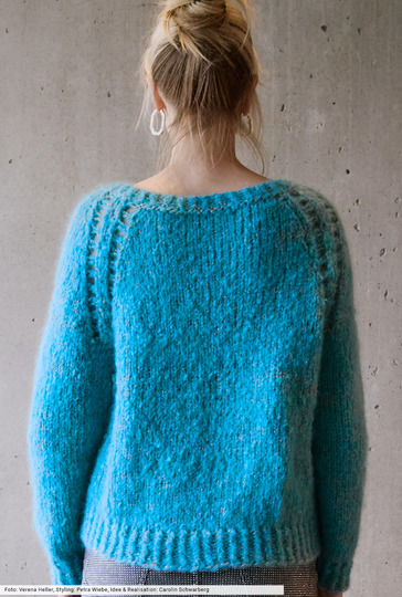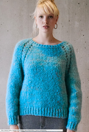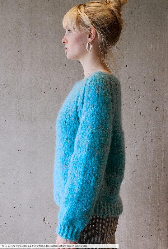 Glitzereffekte bewähren sich nicht nur am Abend, sondern auch tagsüber. Hier haben wir zu einer exklusiven Flauschwolle noch ein schimmerndes Lurexgarn hinzugefügt und beides einfach glatt rechts zu einem locker fallenden Pulli verstrickt. Einziges Detail sind die Raglanschrägungen, die durch Lochstreifen akzentuiert werden. Raffiniert auch die Vorgehensweise: Du strickst von oben nach unten alles in Runden und ersparst dir somit das Zusammennähen der vier Teile.