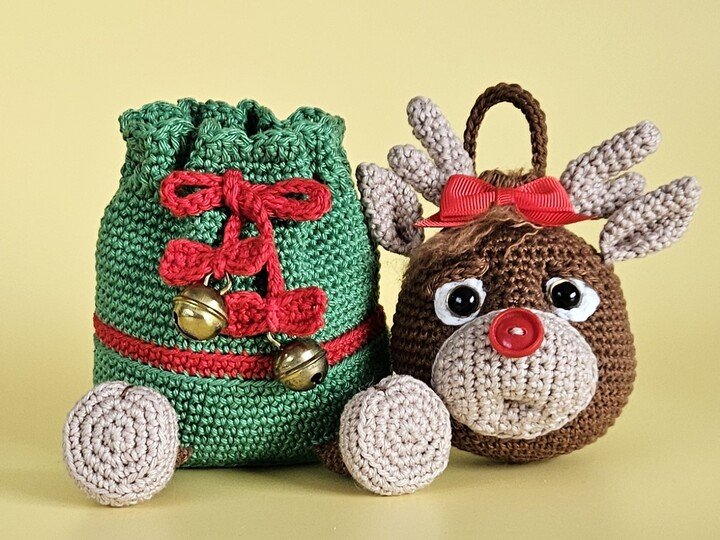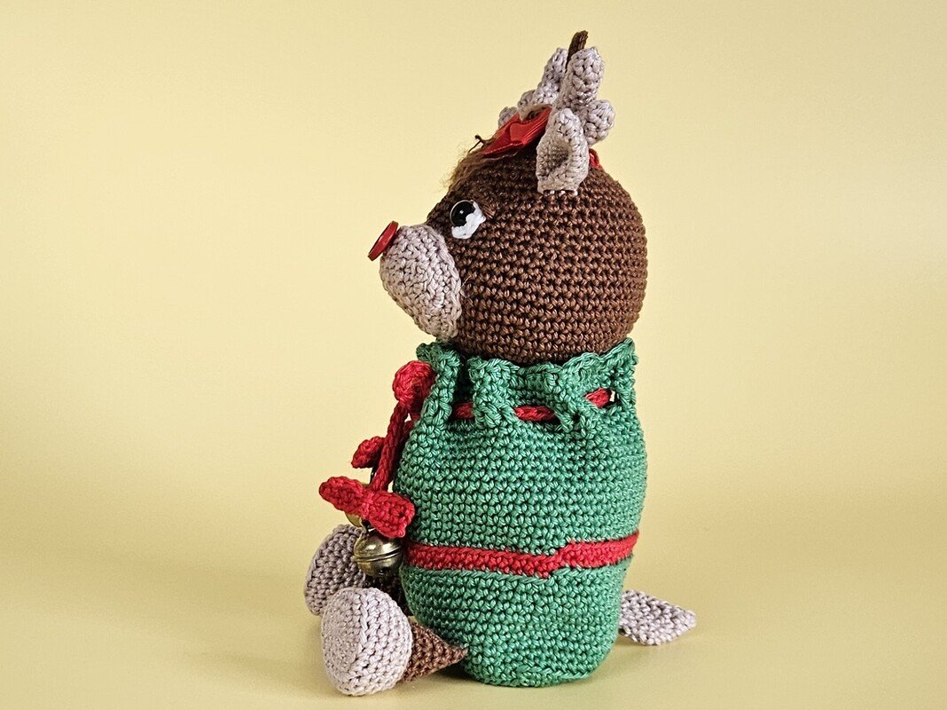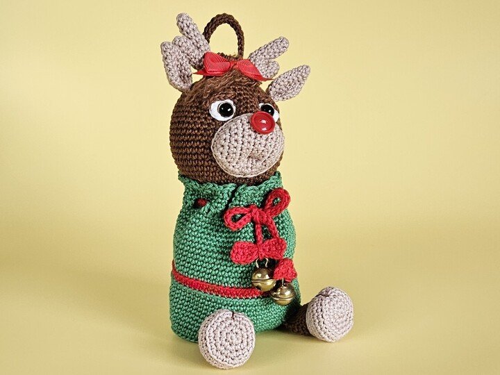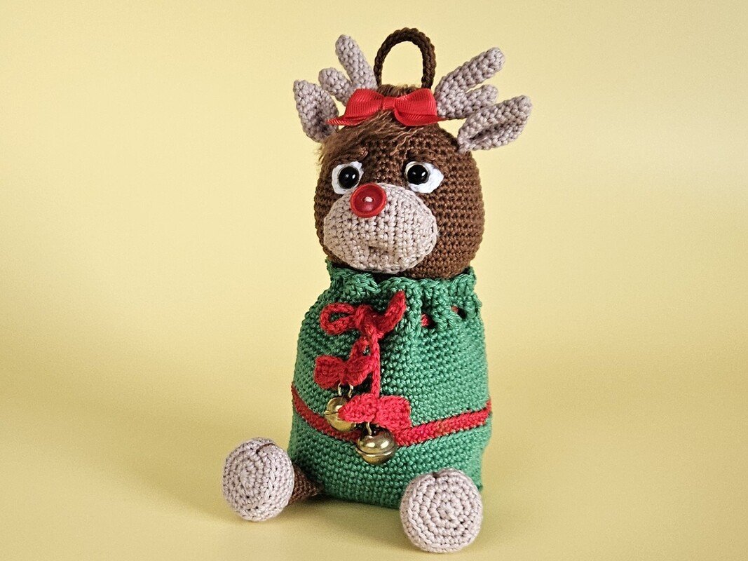 Das grüne Säckchen bietet Platz für kleine Geschenke oder Leckereien und wird durch ein rotes Band mit Glöckchen und roten Schleifen verschlossen. Besonders niedlich: aus dem Säckchen schauen die niedlichen Beine hervor. Das Rentier, geschmückt mit einer roten Schleife und einer witzigen Knopf-Nase, schielt leicht und dies verleiht ihm somit einen frechen Ausdruck. Der Clou: Der Kopf kann auch als Christbaumkugel verwendet werden und sorgt so für doppelte Freude – ob als Deko oder kleines Mitbringsel.