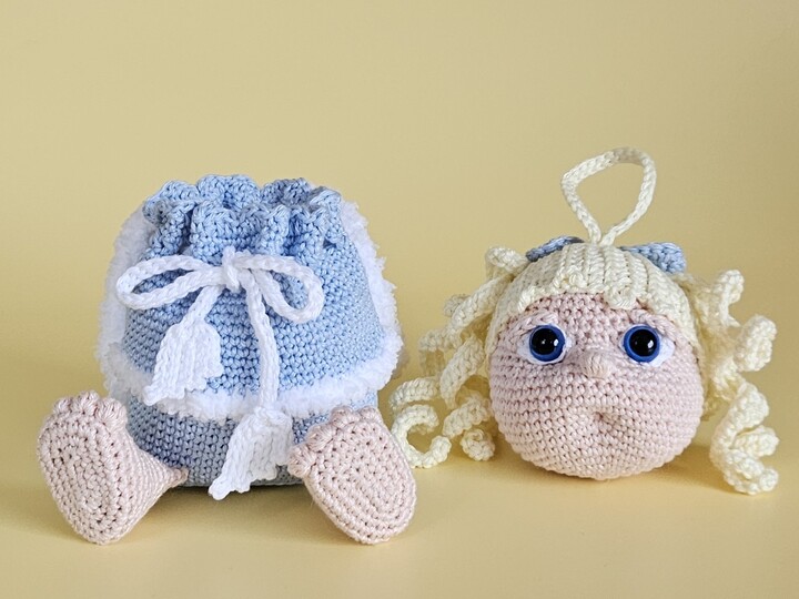 Die Füßchen schauen frech unten aus dem Säckchen heraus, und hinten schmücken hübsche Engelsflügel den Beutel. Ein Band mit kleinen Flügelchen dient als Verschluss.